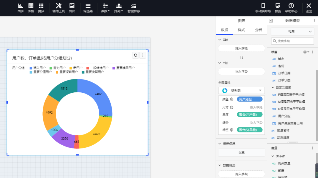 (1)新建一个环形图,然后将「用户分组」和「用户数」字段分别拖动到颜色和角度,如下:
