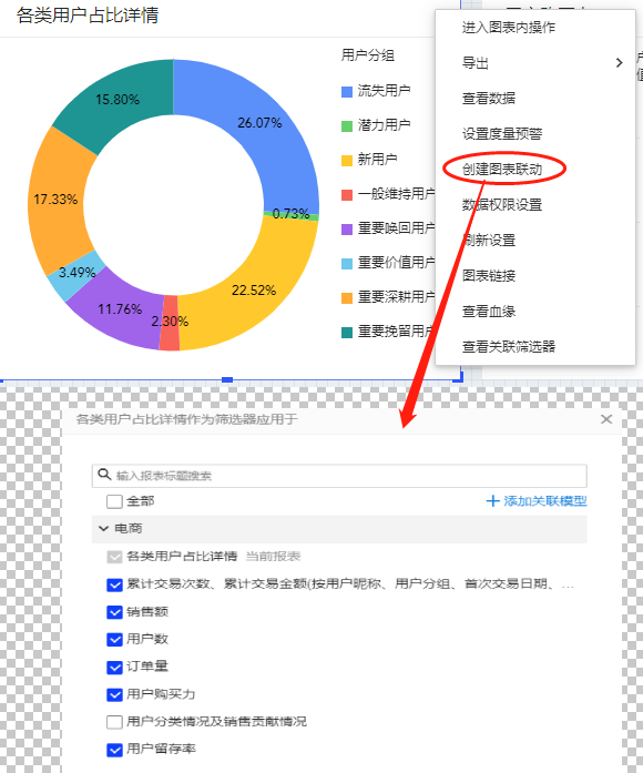 (4)在图表[各类用户占比详情]中添加图表联动,关联页面内的其他图表。