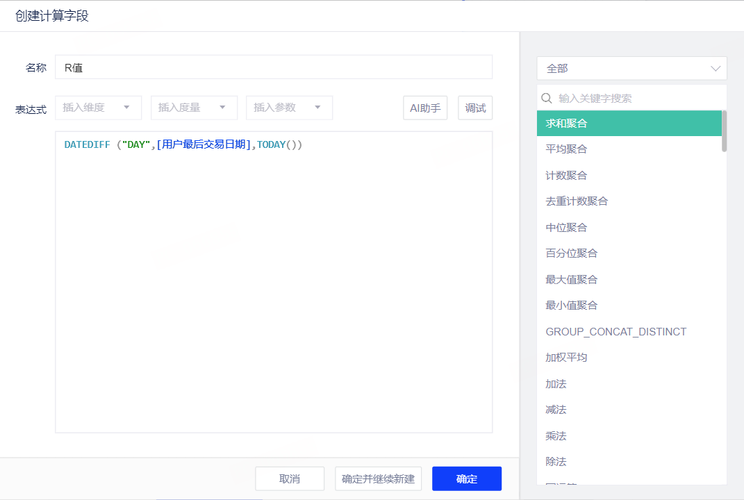 R值=DATEDIFF ("DAY",[用户最后交易日期],TODAY())