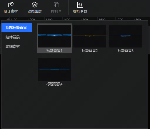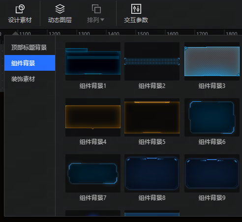 大屏幕前提供:顶部标题背景、组件背景、装饰素材等设计素材,用户可自行查看使用。