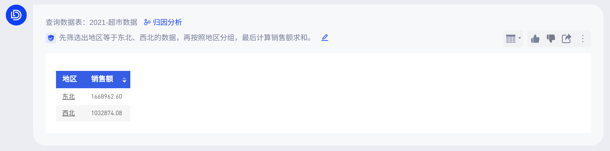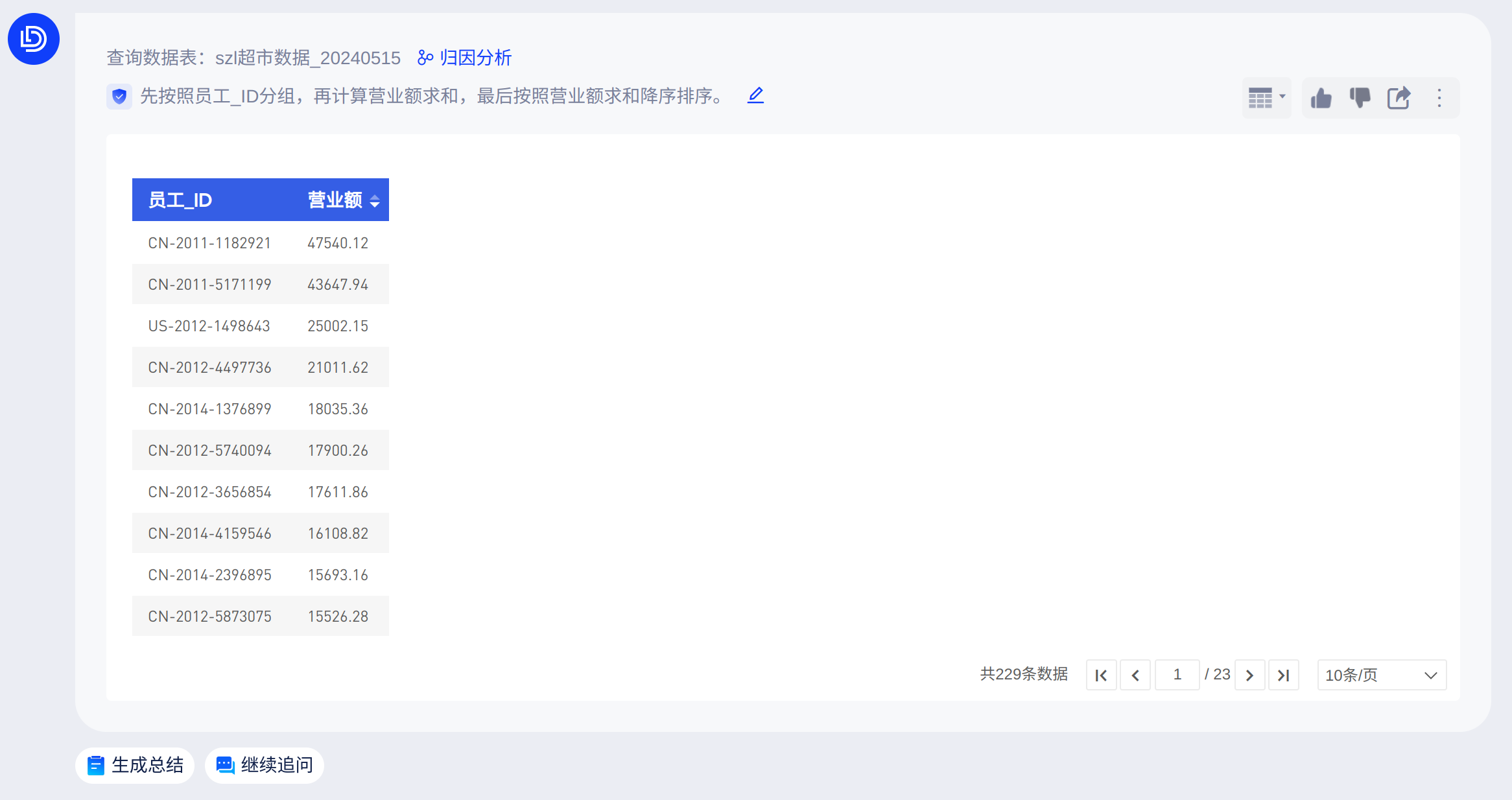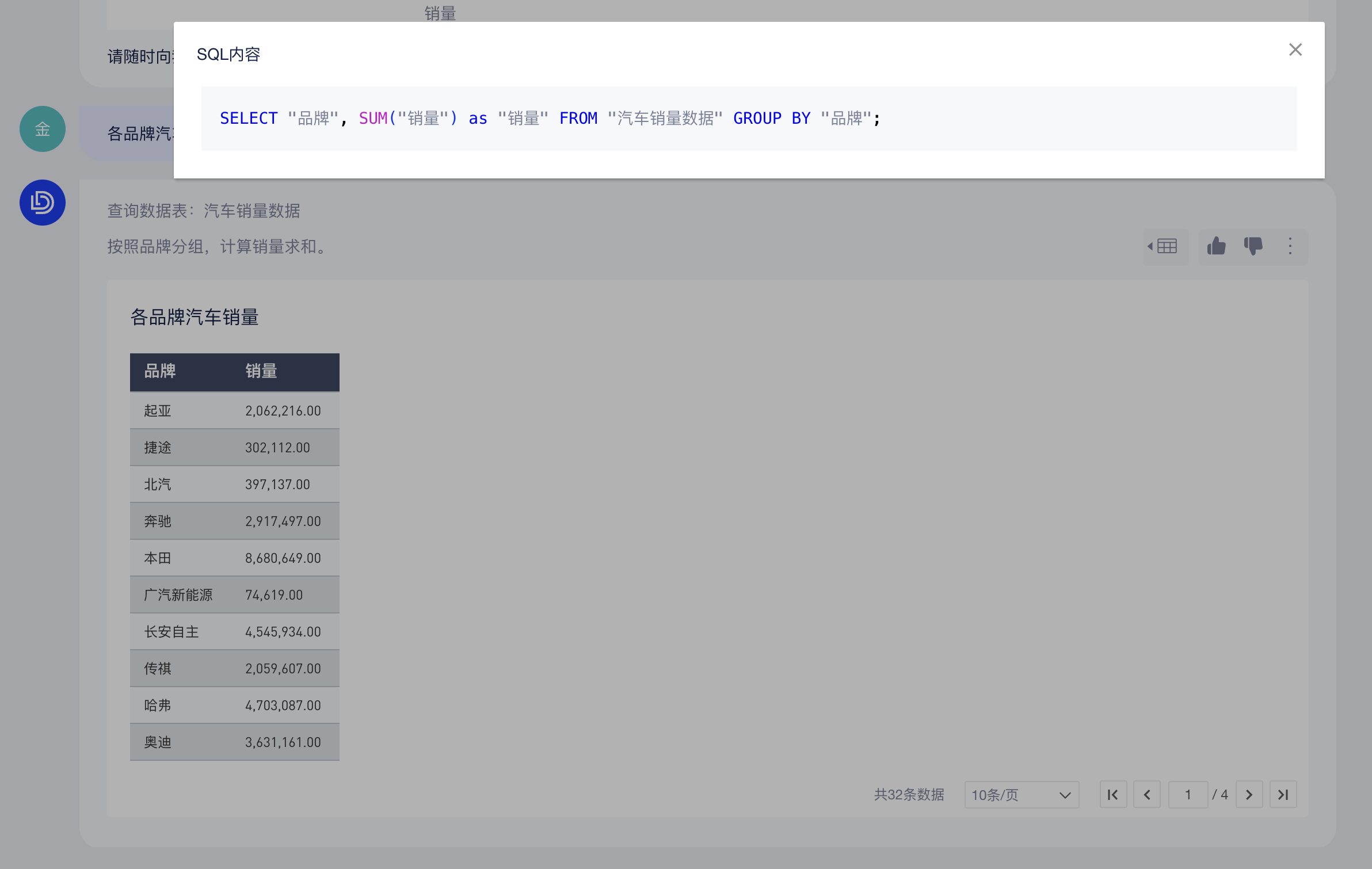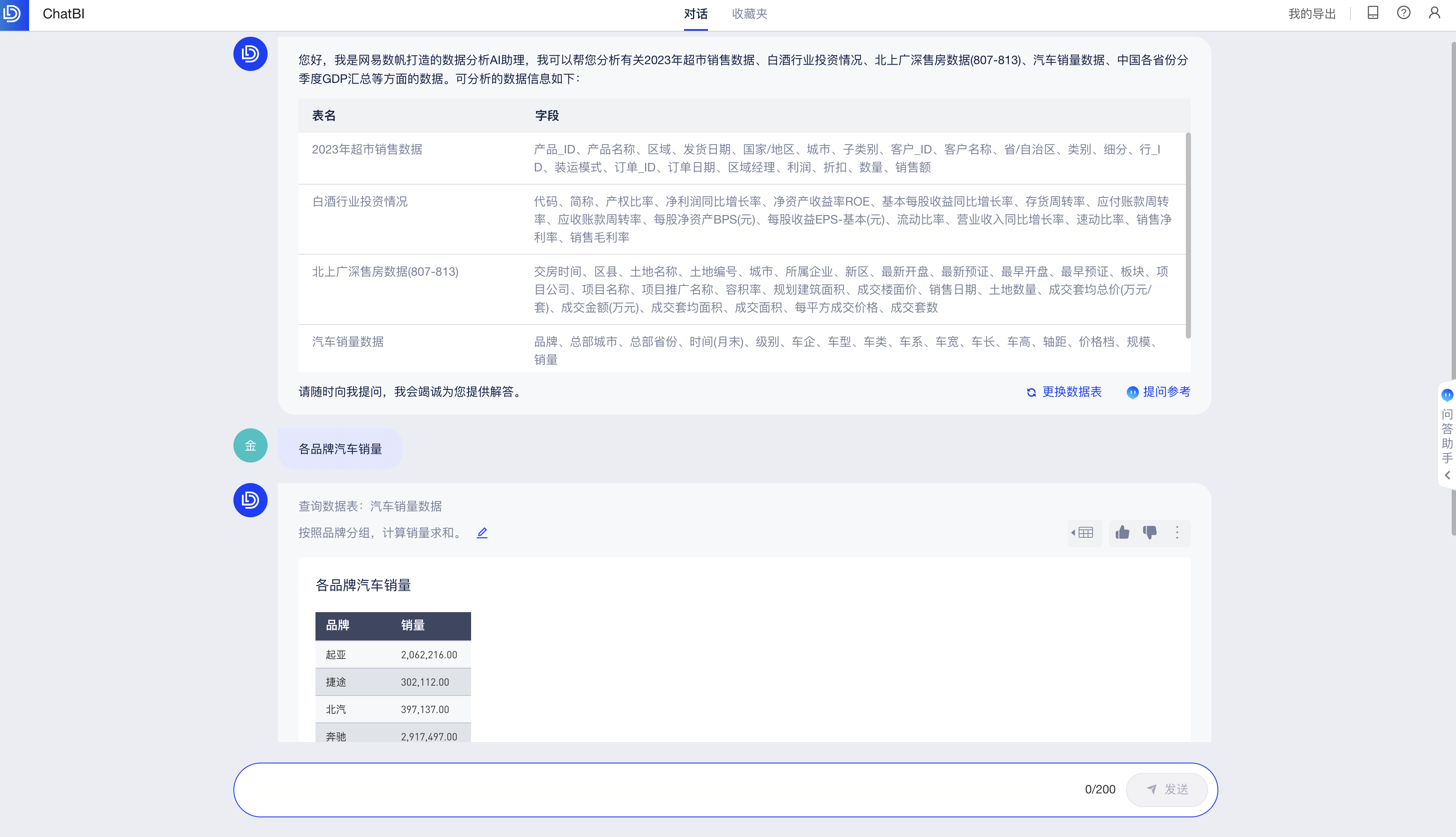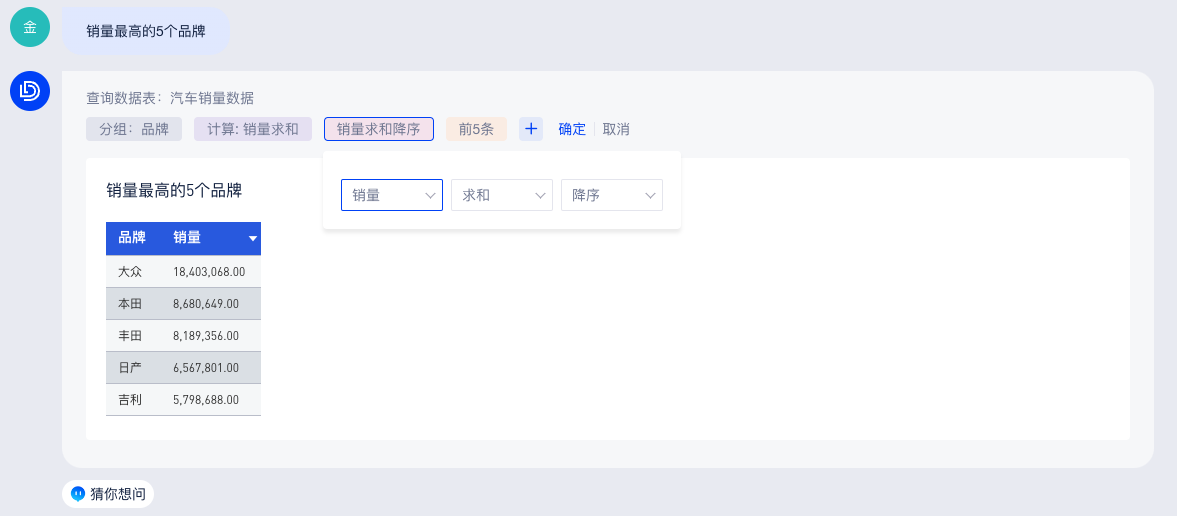 你可以直接在底部输入框中提问(当前仅支持从单个数据表中查询结果),AI助手会回答查询条件和查询结果,如下图: