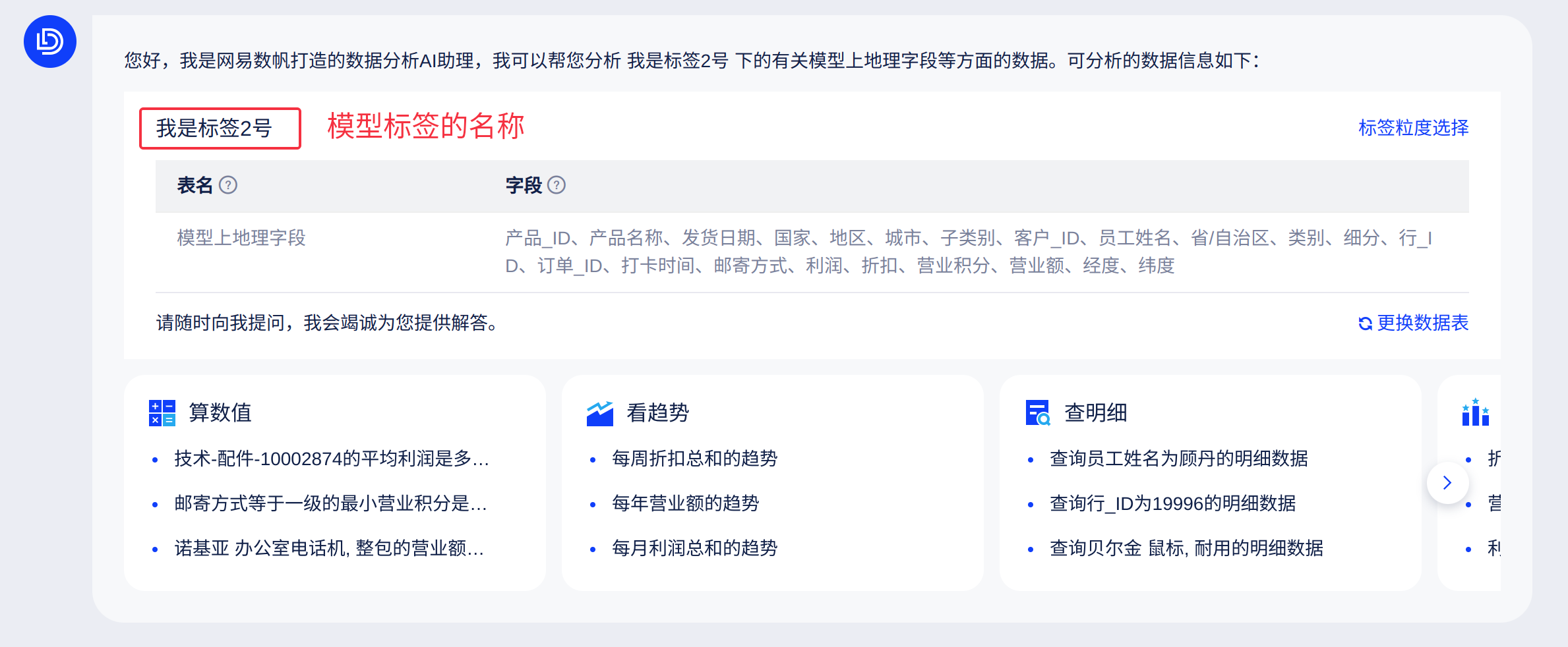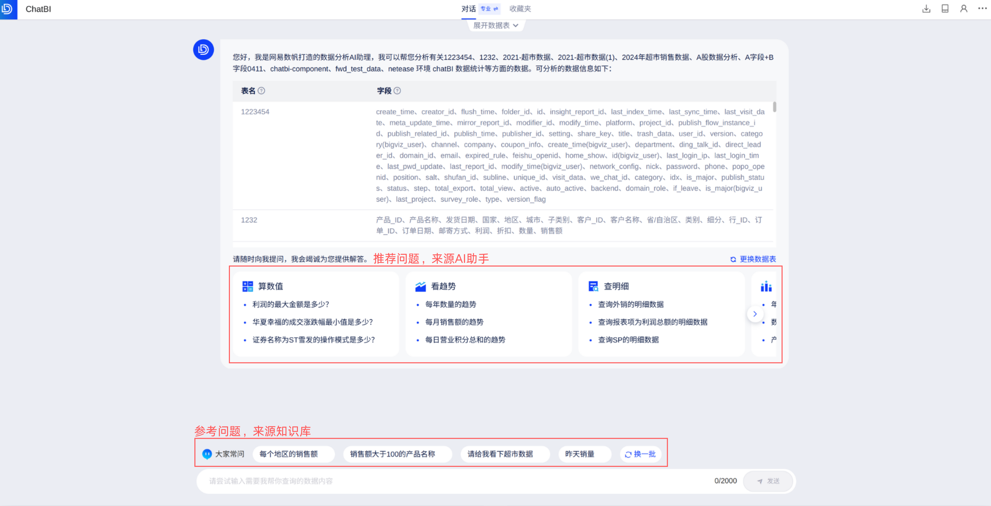 - AI助手首先会向你介绍你可以使用的数据表有哪些,并在数据表下方展示六类推荐问题:算数值、看趋势、查明细、TopN、做比较、同环比。若「知识库」有配置的参考提问,这些问题会通过「大家常问」展示在底部的输入框上方,如下图: