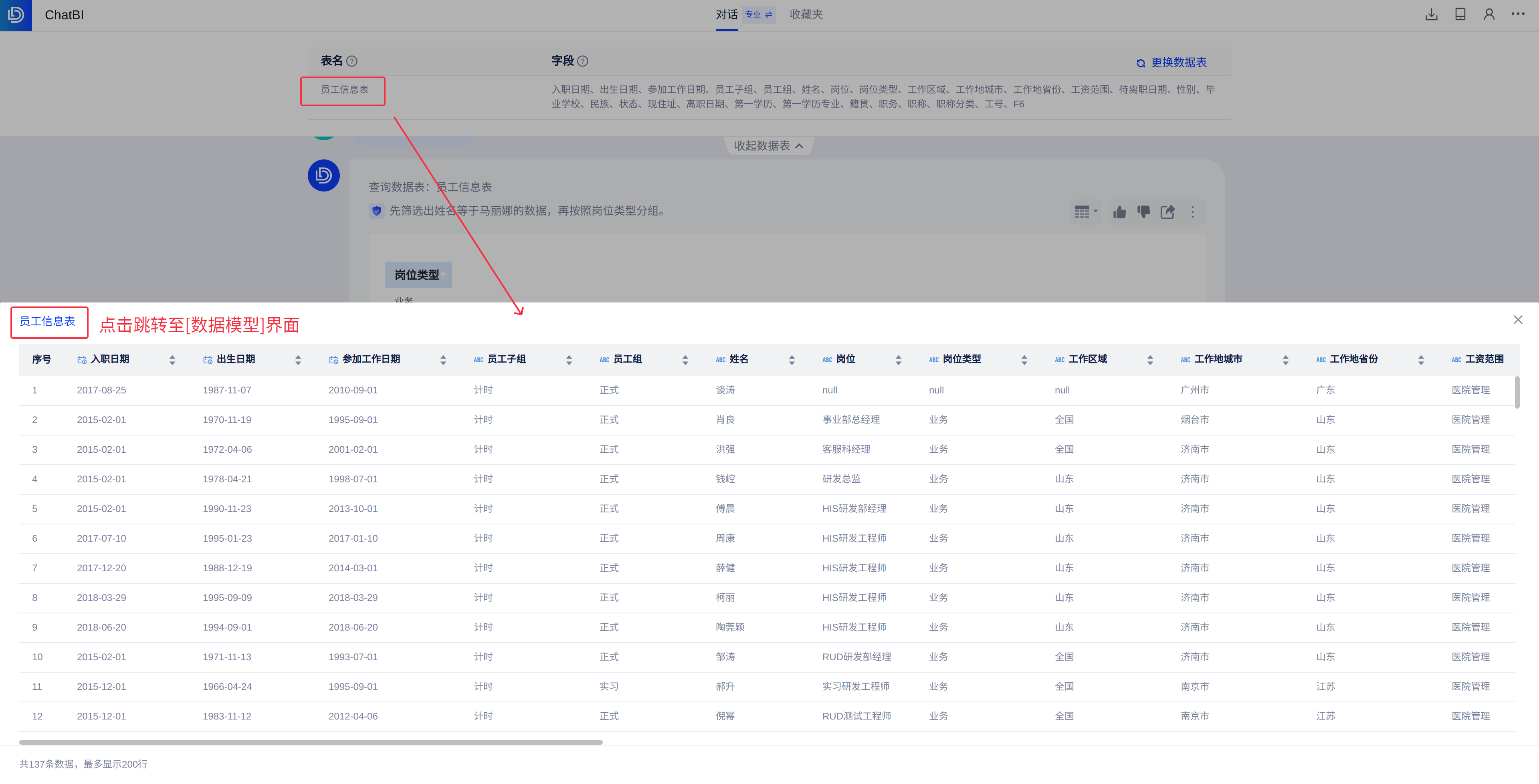 若AI选错了数据表,可点击「换表查询」,校正为正确的数据表。