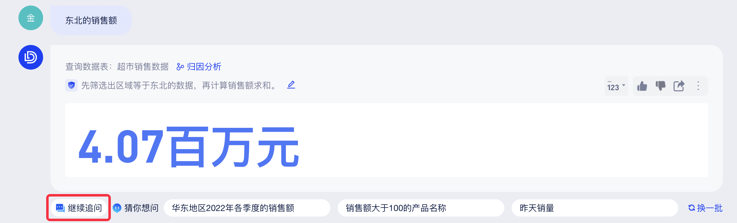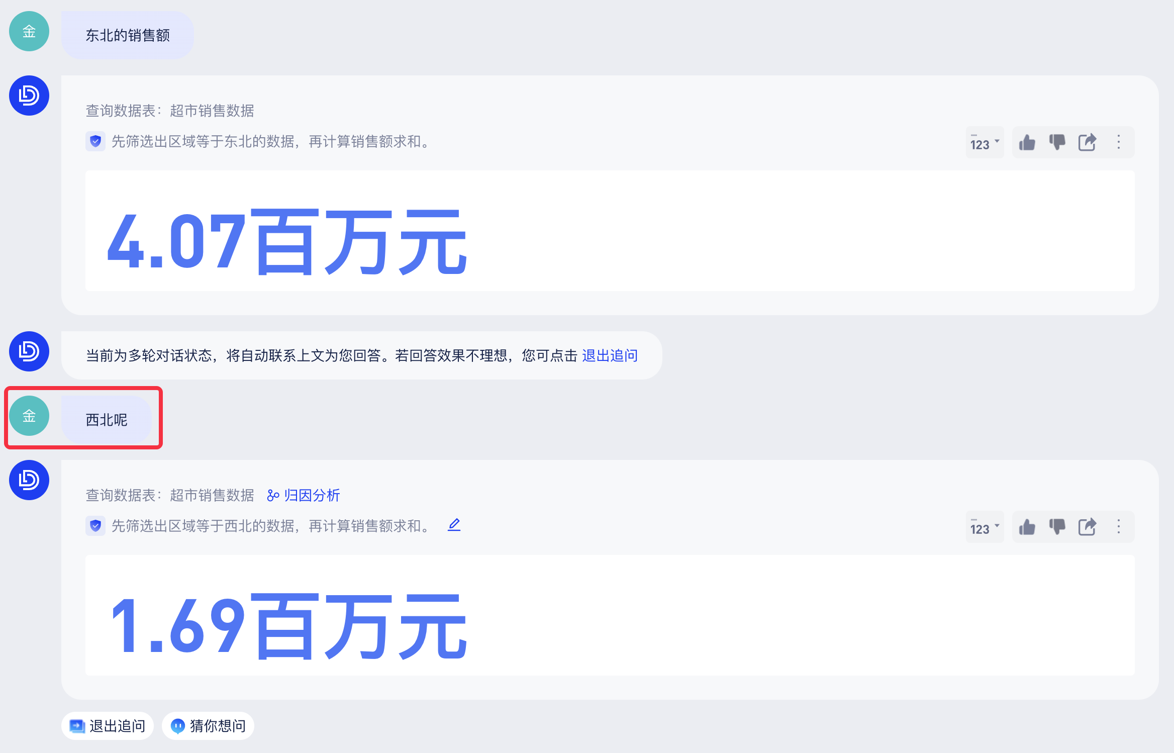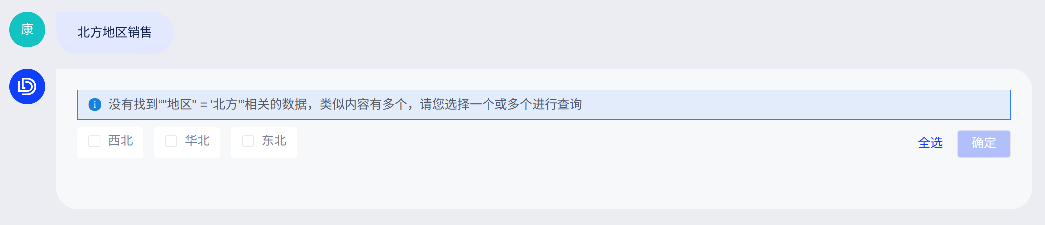 1)多成员项或指标匹配:例如用户查询“北方地区销售”,没有完全匹配用户问题的成员项/指标列,但能够检索到多个相似值时,AI助手展示相似的成员项/指标列供用户选择。