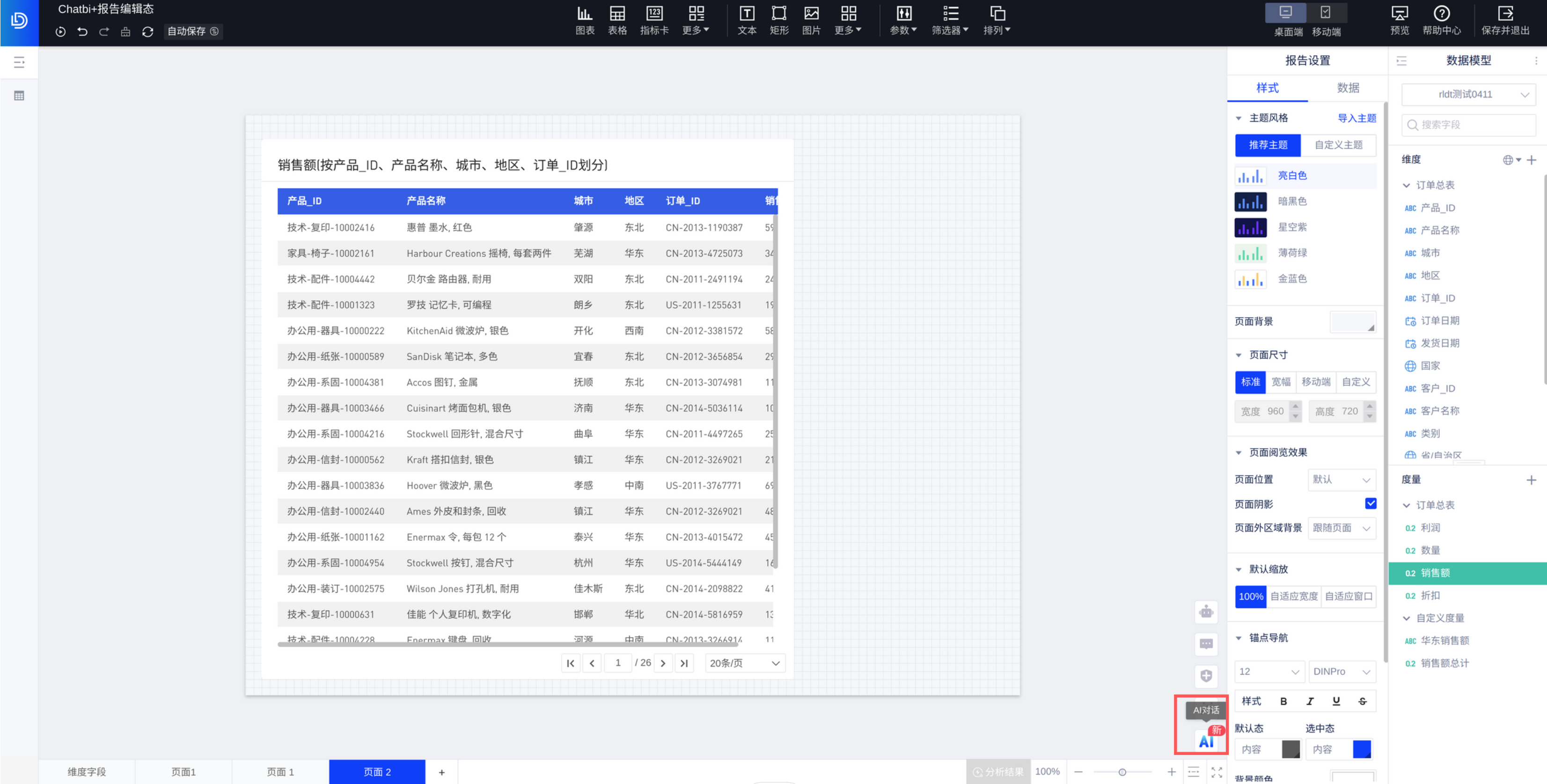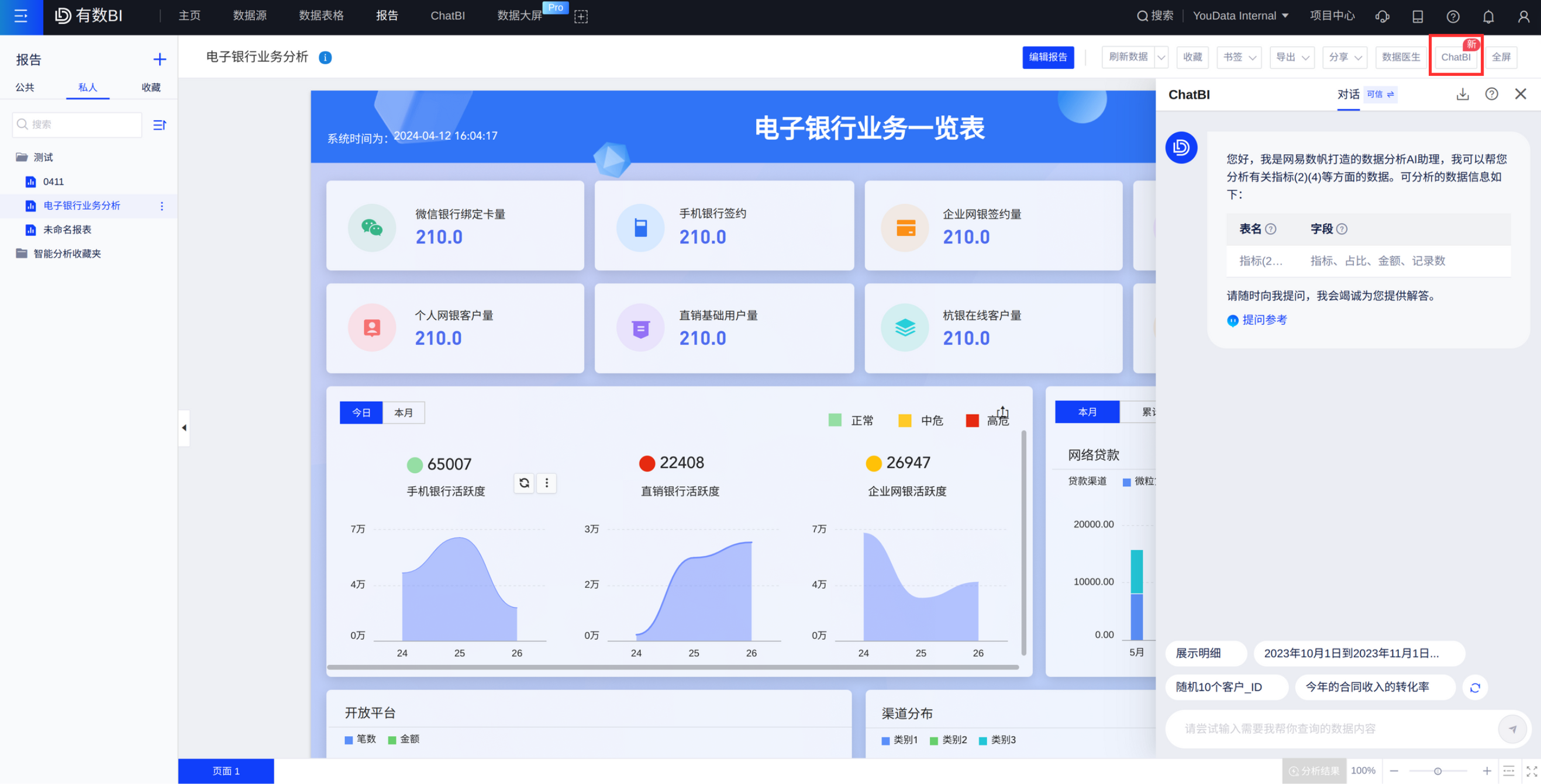 方式二:若报告页面所使用的数据模型已经开启「ChatBI」,则报告阅览态,右上角点击「ChatBI」后在报告右侧显示ChatBI的问答界面,如下图: