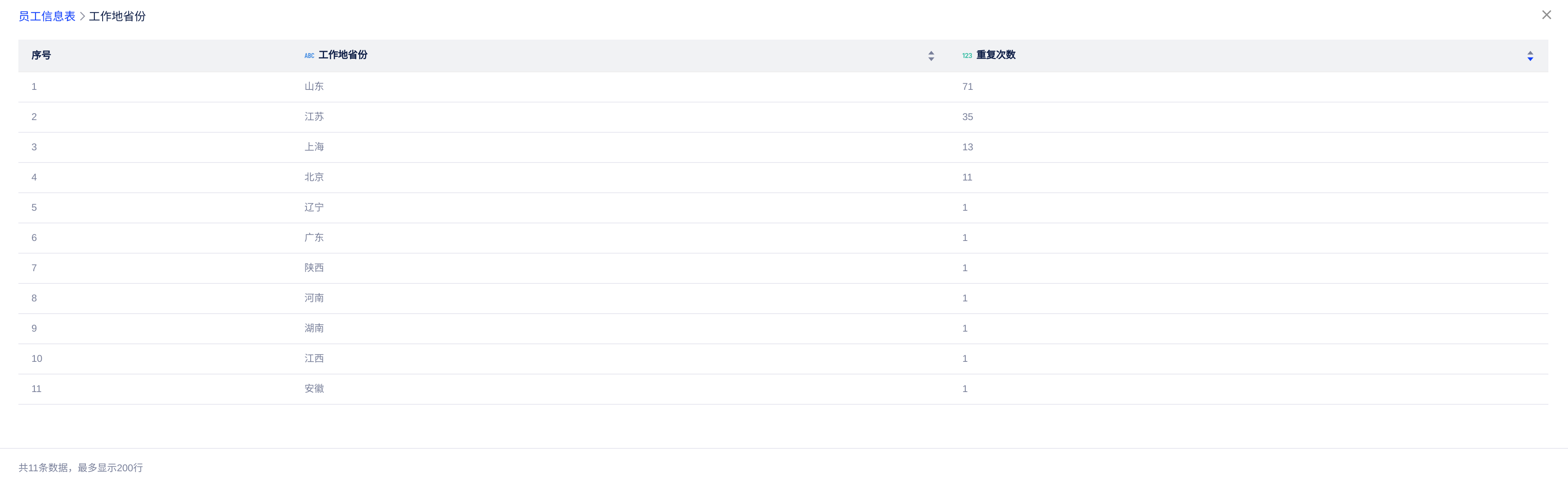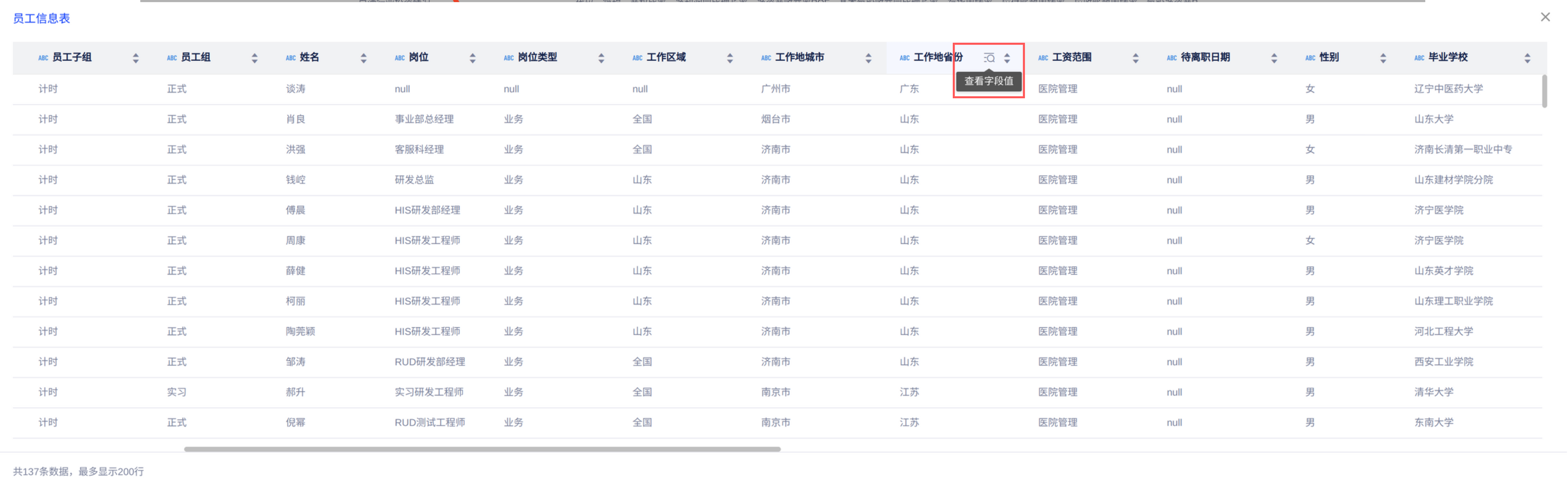 - 点击字段右侧的「查看字段值」按钮,则可对具体字段包含的值及分布。