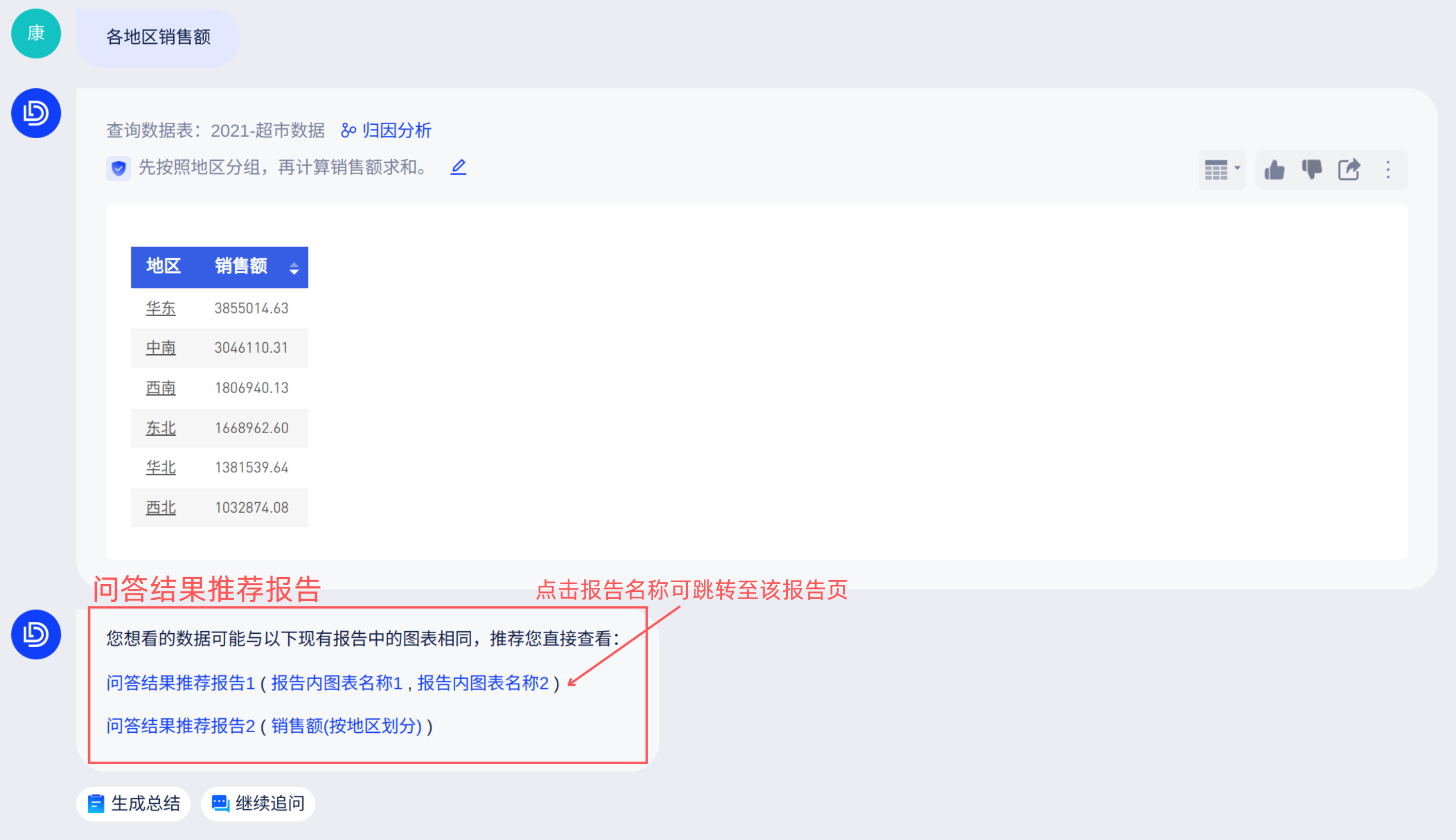 例如,当用户查询“各地区销售额”时,报告中存在基于相同数据模型搭建的图表,点击链接即可跳转至报告页。