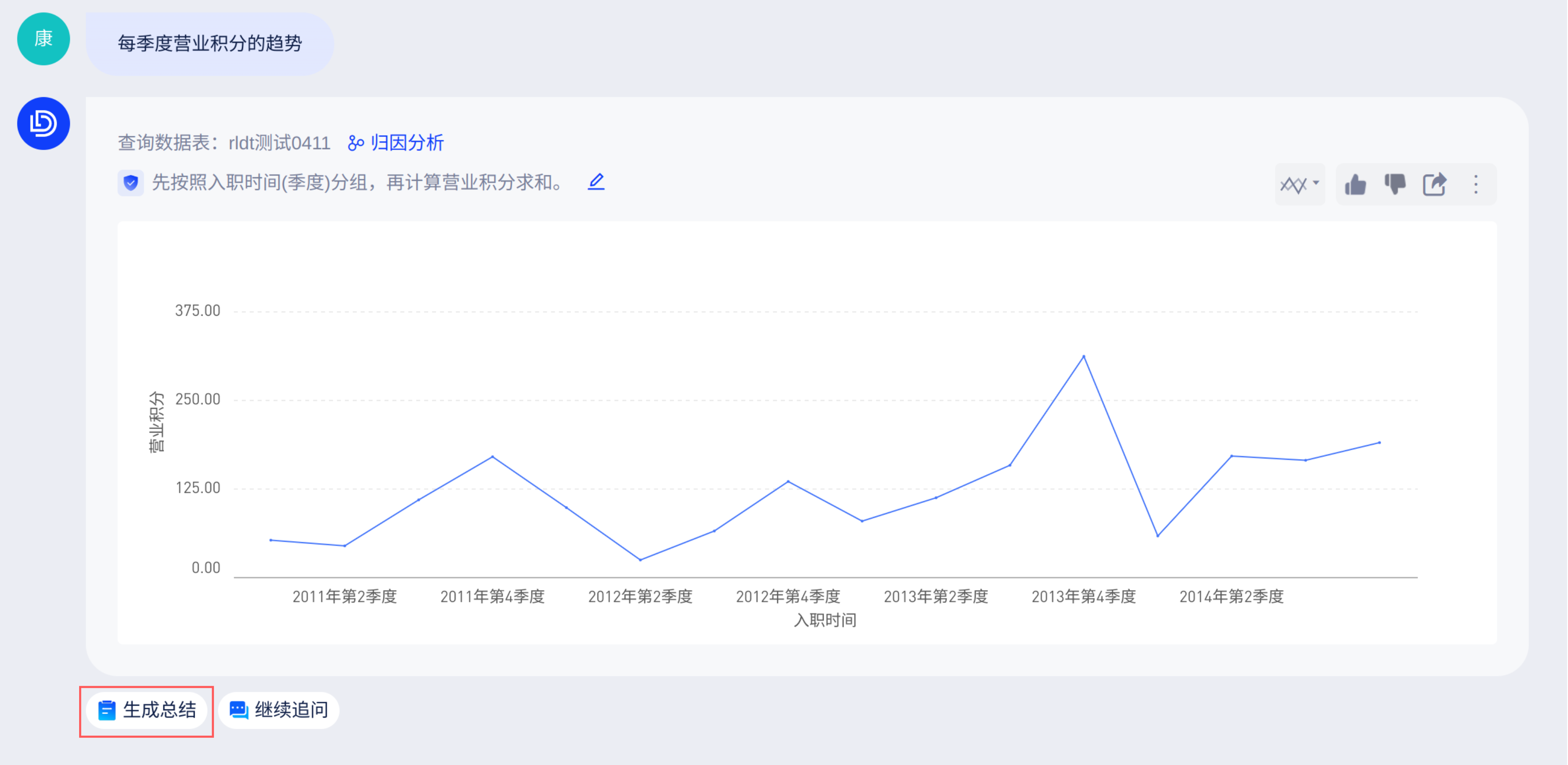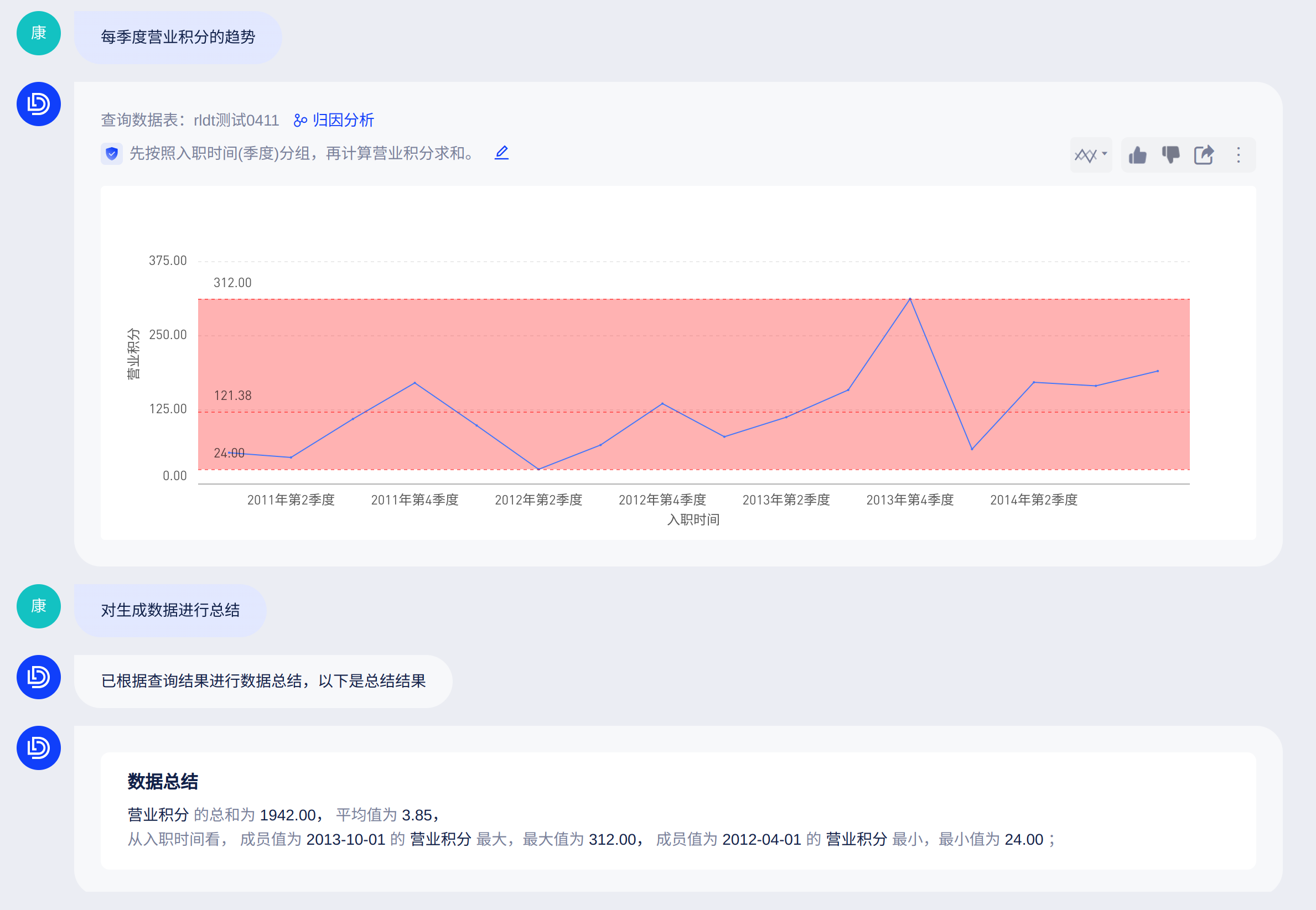 基于ChatBI问答展示的图表,提供自动生成数据总结,通过描述性统计,帮助您快速获取全面且准确的数据概述。例如,当用户查看"每季度营业积分的趋势"时。