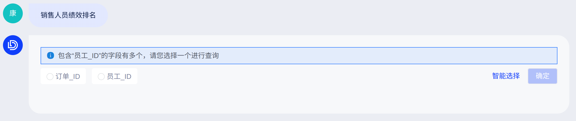 2)成员项目存在于多个字段时:当用户问题中提到的成员项目存在于多个字段时,比如“销售人员绩效排名”,查询的“ID”的字段有多个,会提示您选择一个进行查询,点击[确定]即可呈现数据表(参考下图),若您不确定所需字段,可点击[智能选择]。
