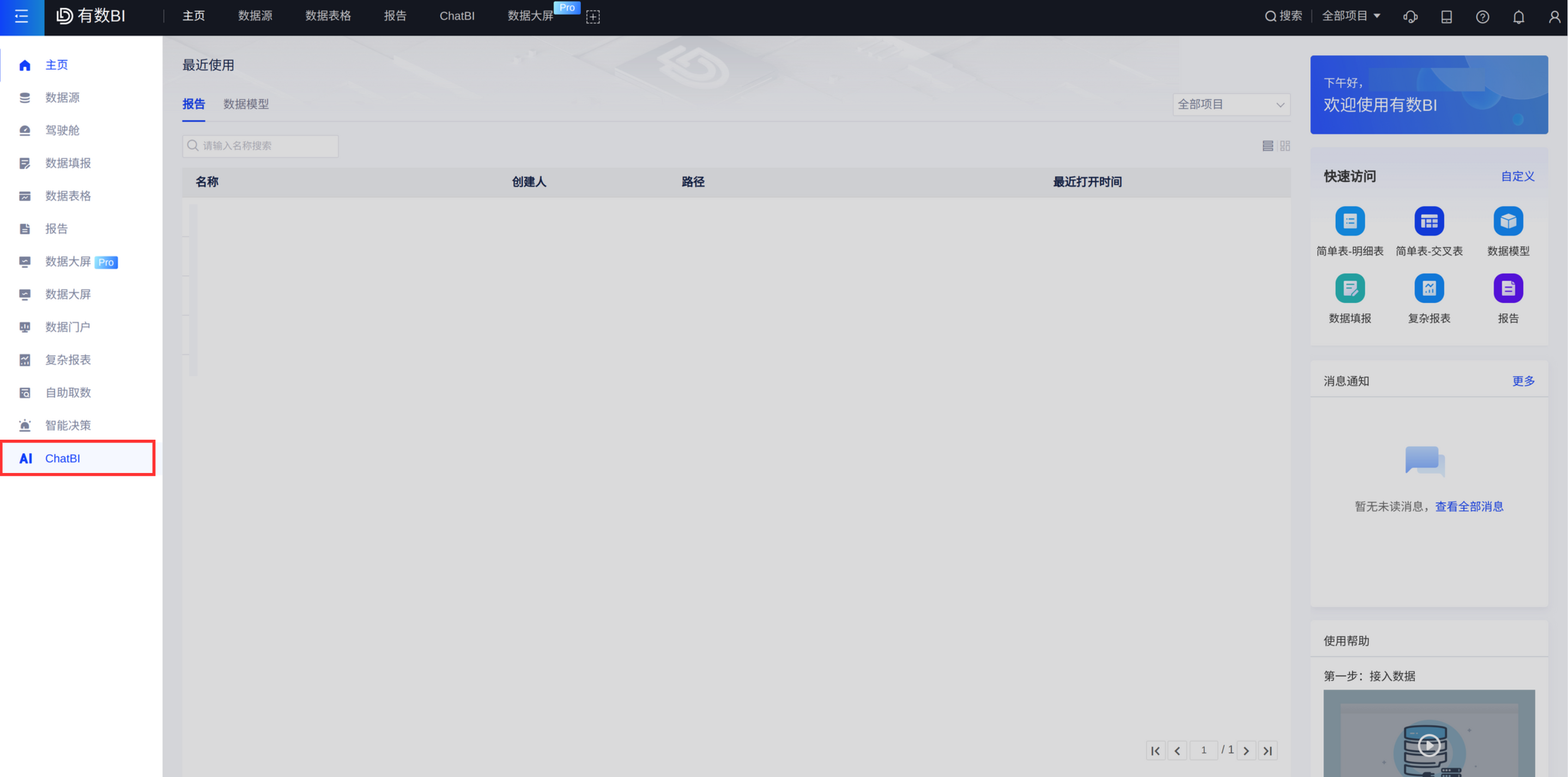 方式一:从有数BI的左侧导航点击“ChatBI",即可进入ChatBI的聊天窗口,如下图: