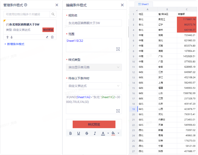 例5:设置东北地区销售额大于30000的单元格为红色。