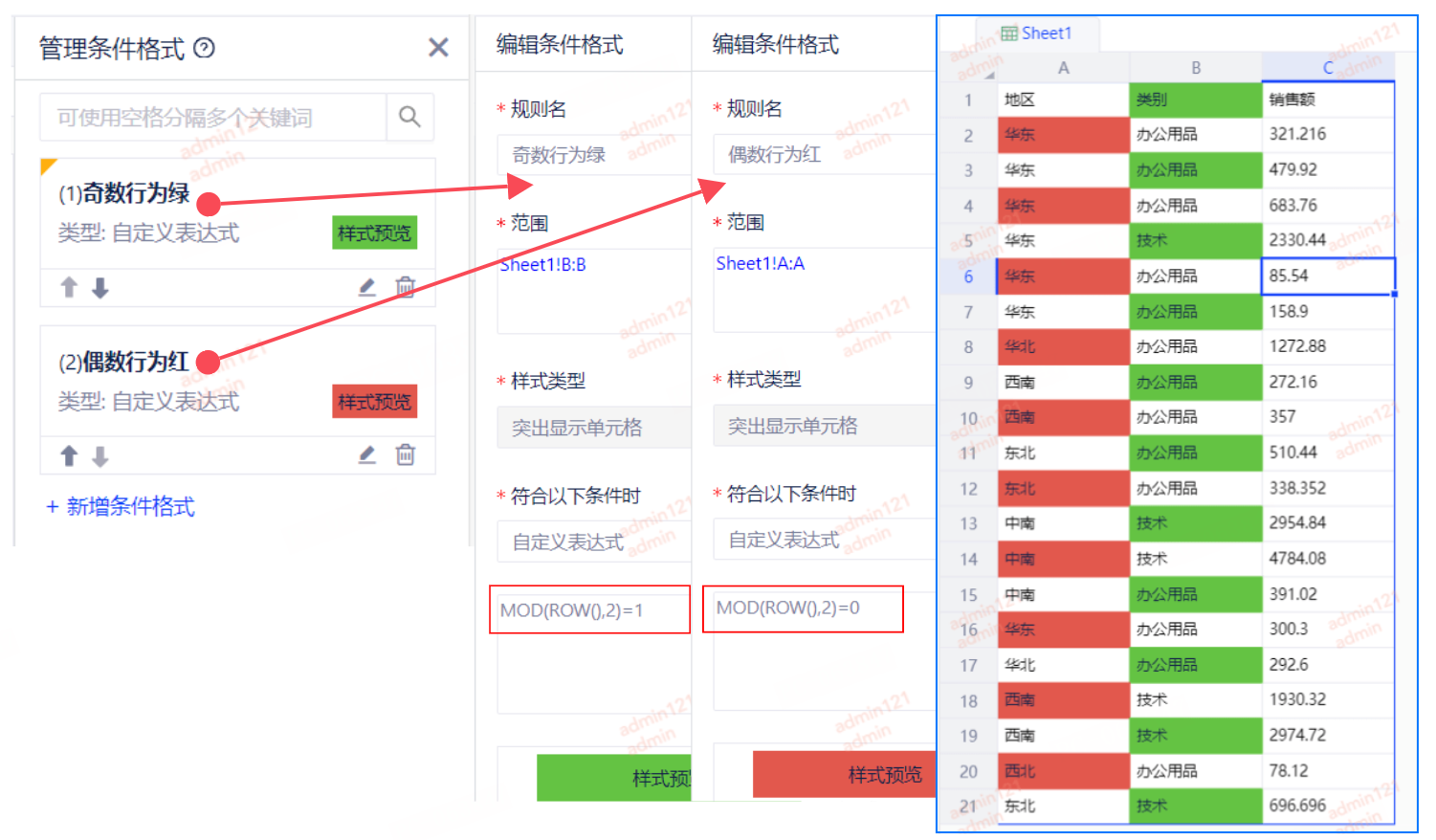 例2:设置B列奇数行为绿色,A列偶数行为红色。
