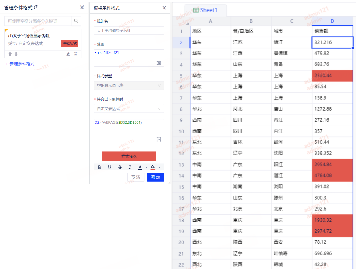 例3:设置销售额大于平均值的单元格为红色。