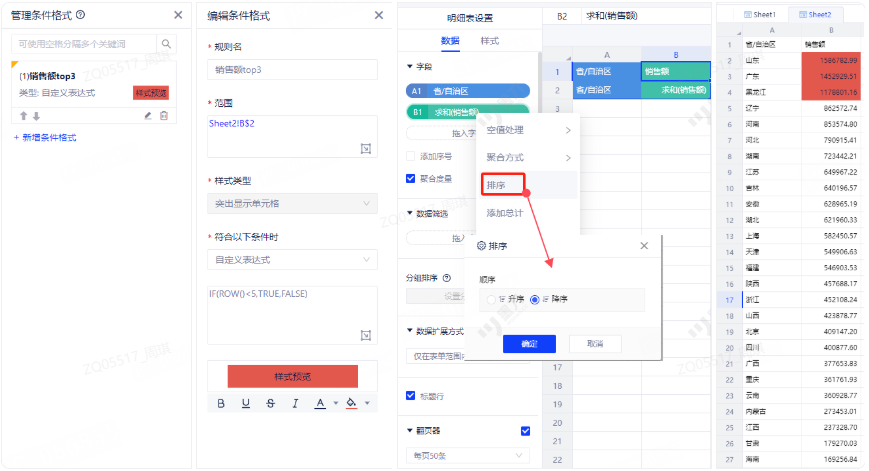 例6:设置销售额top3的单元格为红色(需排序)。