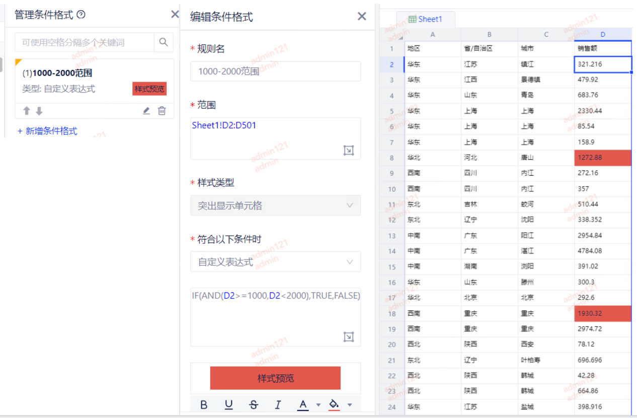 例4:设置销售额在1000-2000范围内的单元格为红色。