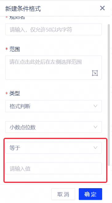 小数点位数:用户选择小数点位数时,支持设置判断条件为"等于、不等于",并自定义小数点位数。