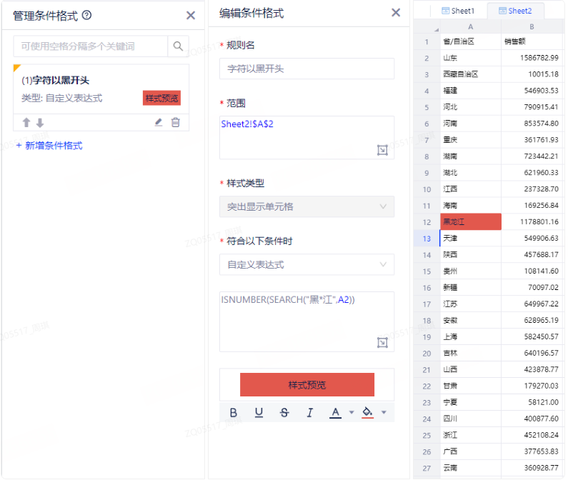 例1:设置内容满足以 "黑" 开头并以 "江" 结尾的单元格格式。