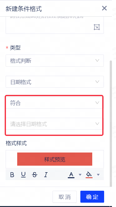 日期格式:用户选择日期格式子类型时,支持设置判断条件为“符合、不符合”,并支持从格式库中选择已有的日期格式类。