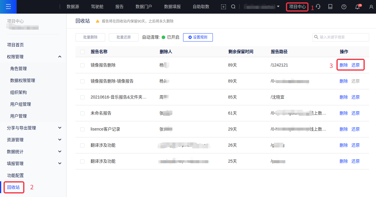 回收站用于存放当前项目下删除的报告,可在回收站找回。目前仅显示近90天内删除的报告,更早被删除的报告不可恢复。
