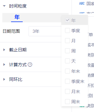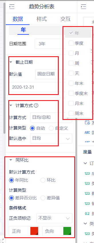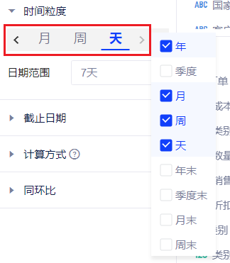 (1)支持快捷切换时间的展示粒度,同时每一个时间粒度支持单独设置日期范围。您可配置趋势分析表展示的时间粒度,当前支持的时间粒度包括:年、季度、月、周、天、年末、季度末、月末、周末,默认勾选年;