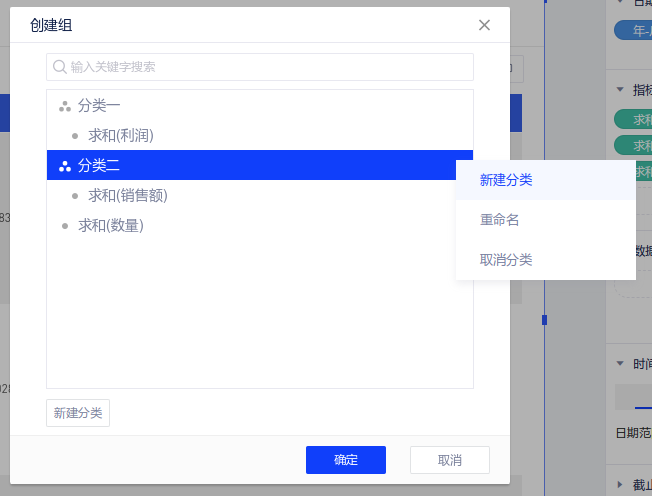 (2)设置分类后,指标/行面板按分类顺序排列,展示分类名以及分类下字段。