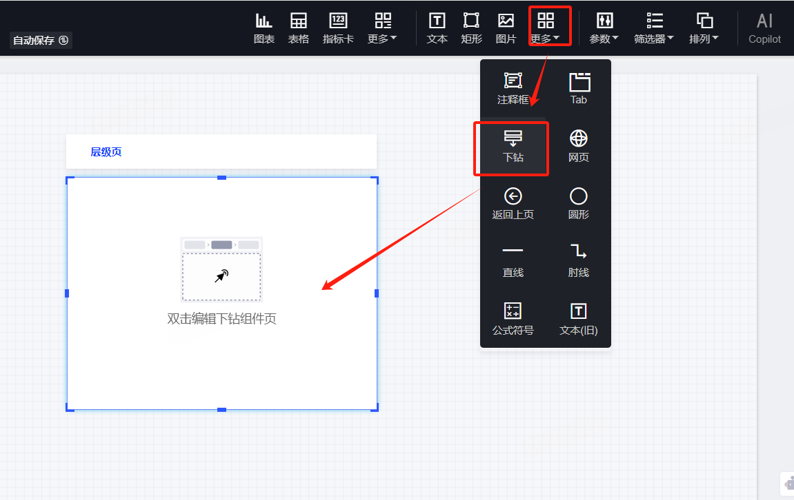 (1)选择“下钻”组件,,在画布上画出一个空白的下钻控件;