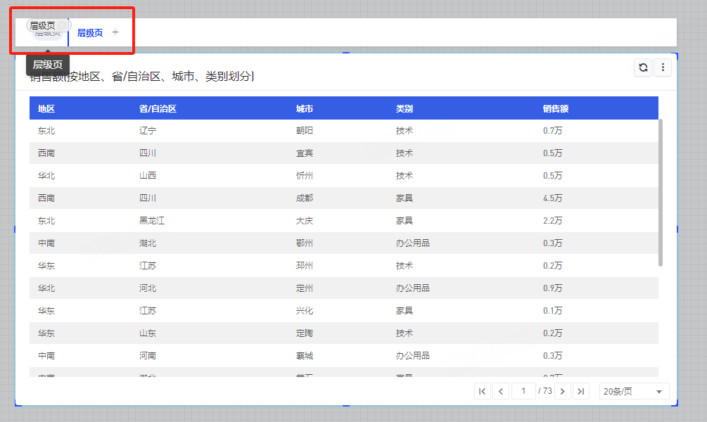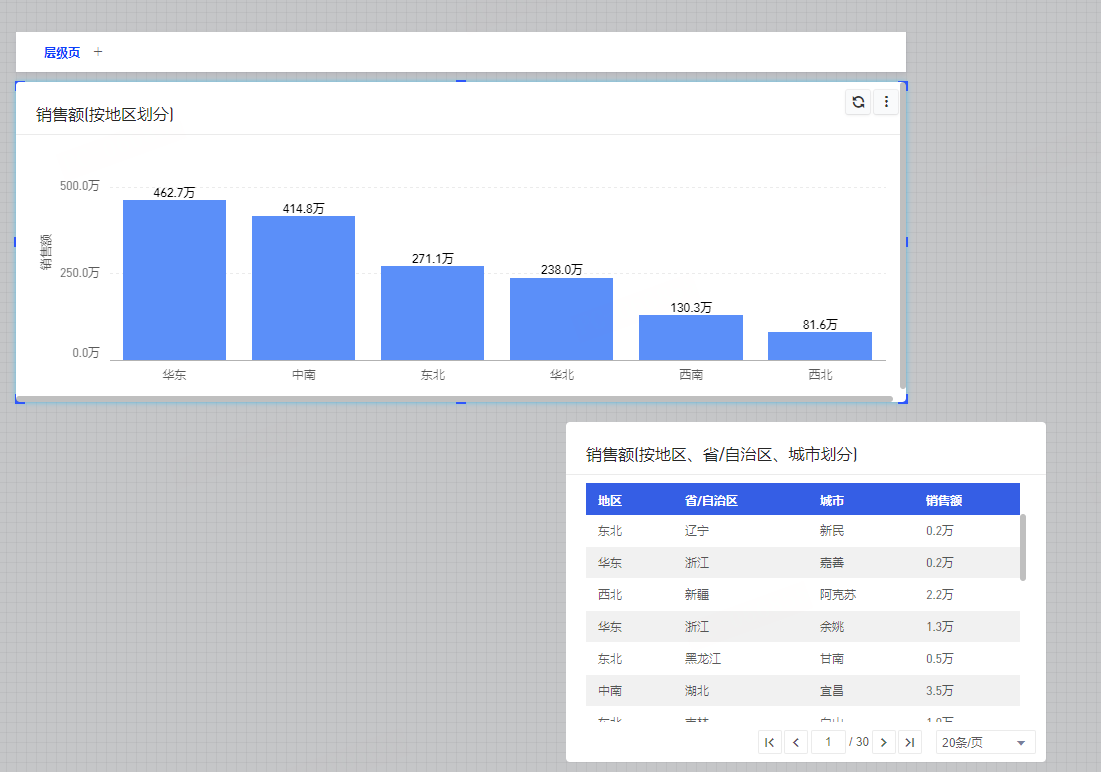 - 层级页支持拖入「图表、表格、交叉表、漏斗图、雷达图、桑基图、旭日图、指标拆解树、指标卡、指标看板、仪表图、热力地图、得分环、k线图、文本框」组件。