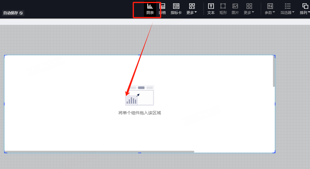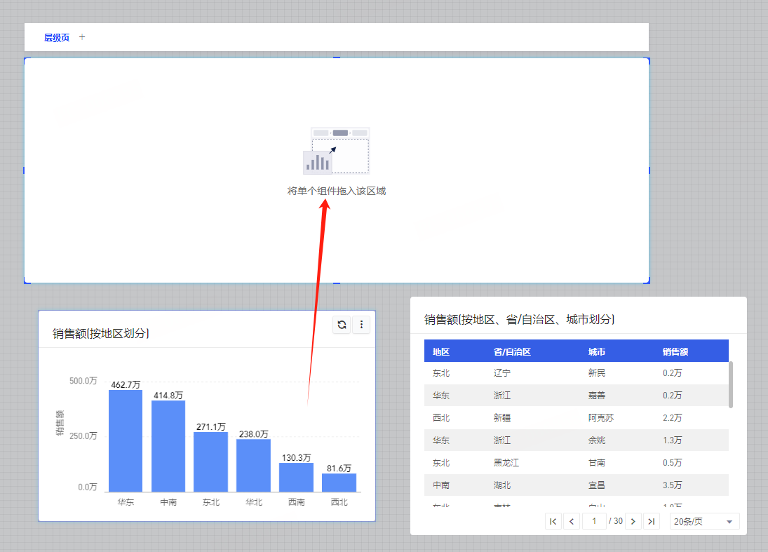 (2)双击画布上的下钻控件,进入控件编辑状态,将其他图表拖入下钻控件(这里我们拖入一个柱状图);