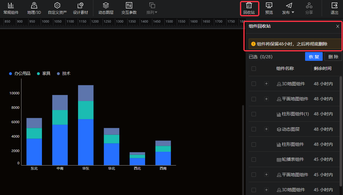 组件回收站入口如下图所示。通过回收站查看48小时内删除组件记录,并进行删除组件恢复。