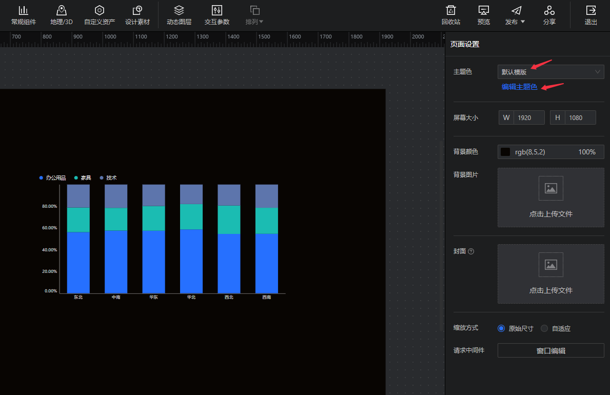 大屏支持设置主题色,可下拉选择模板或进行自定义编辑,统一变换组件的配色风格。