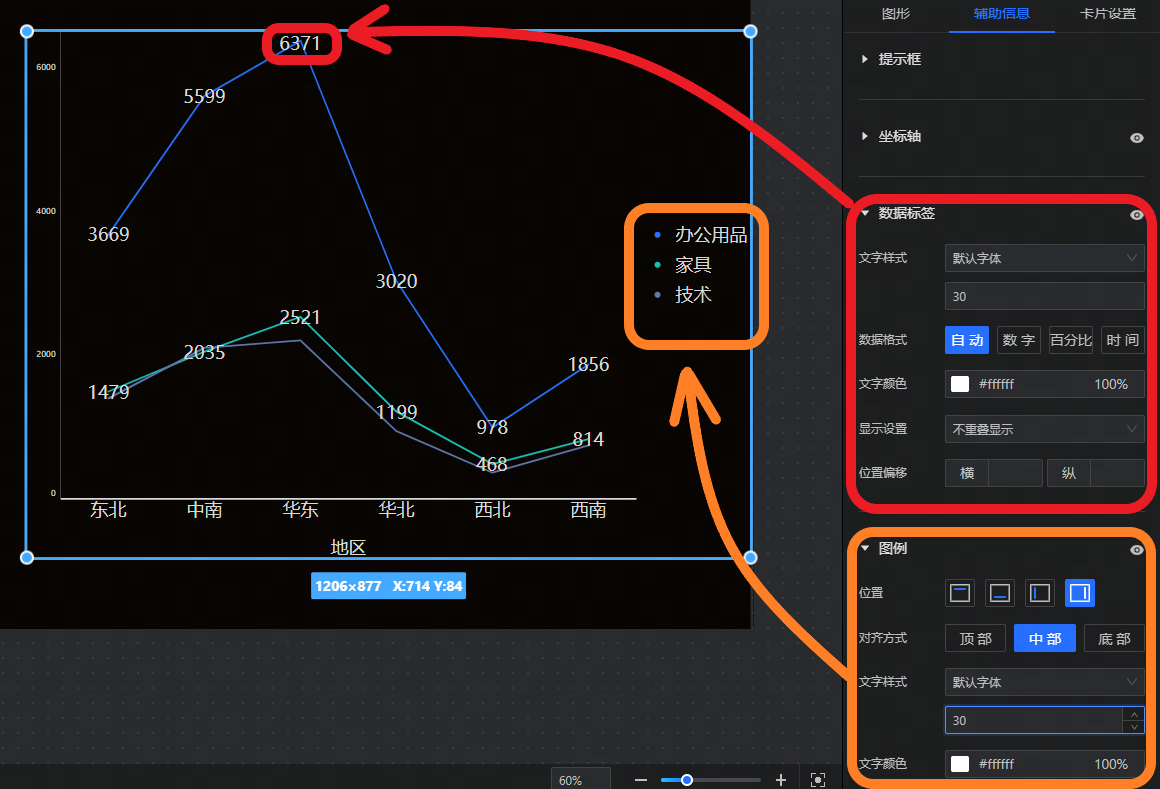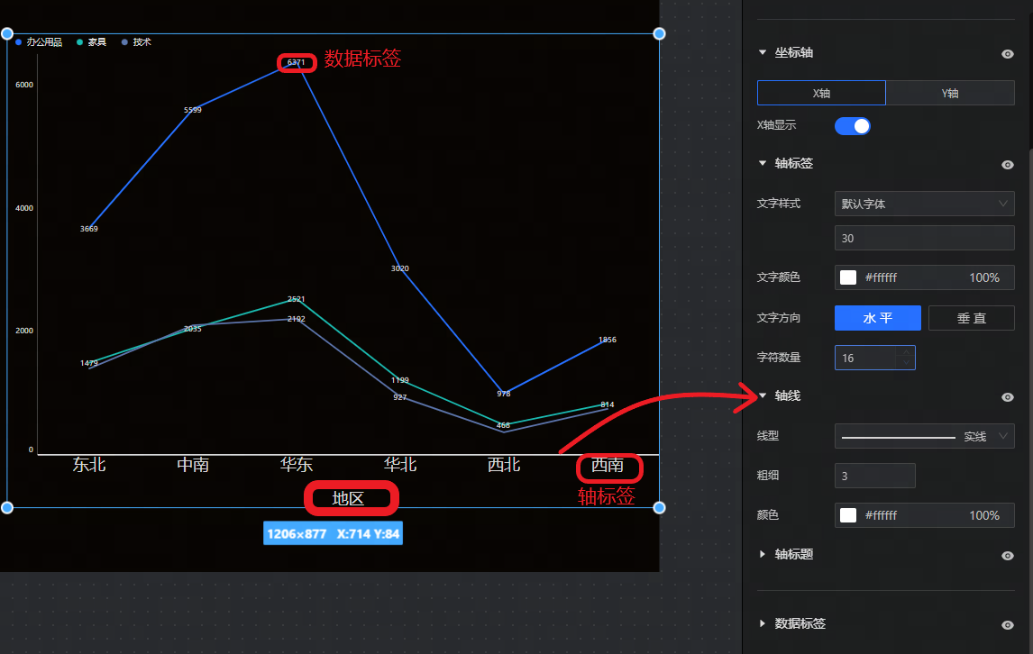 - 数据标签:设置折线图上是否要展示数据标签,以及标签的文字样式。