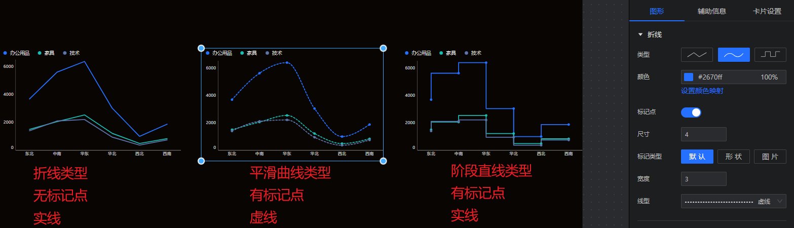 - 折线:设置折线图的线型、颜色、标记点等信息。