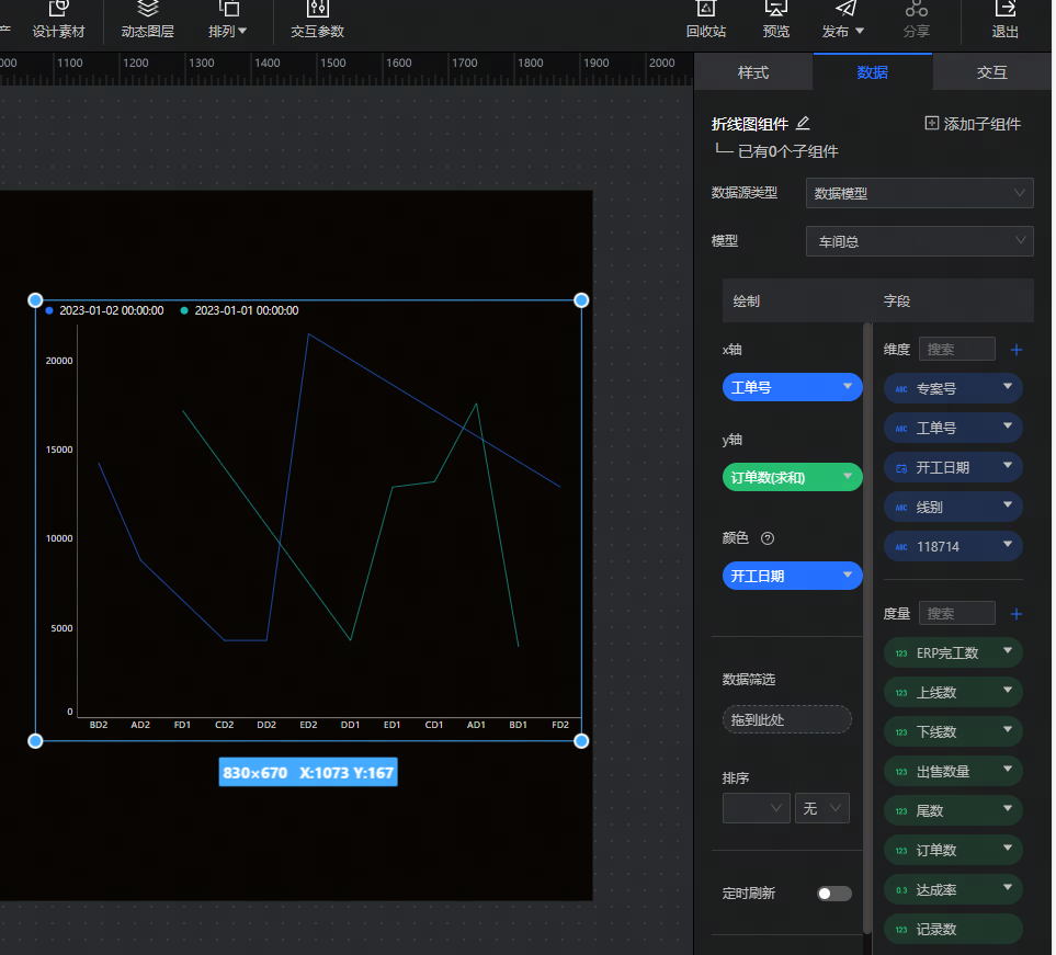 - x轴:设置x轴的维度字段,如下图中的“工单号”字段。