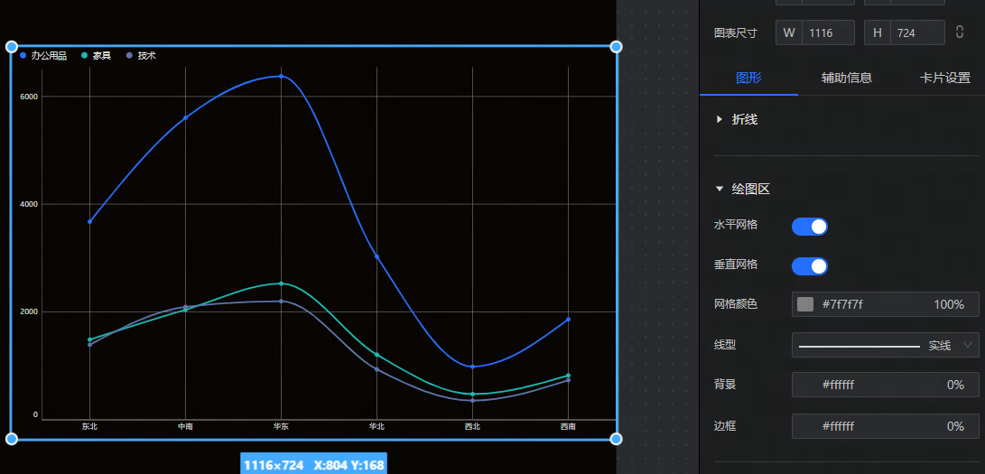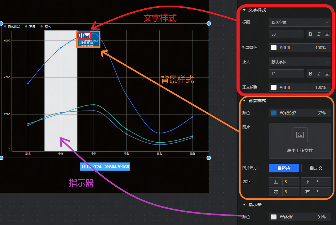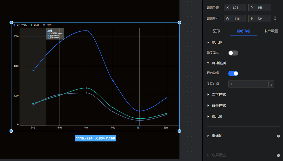- 提示框:设置折线图提示框文字、背景、指示器及是否开启轮播。